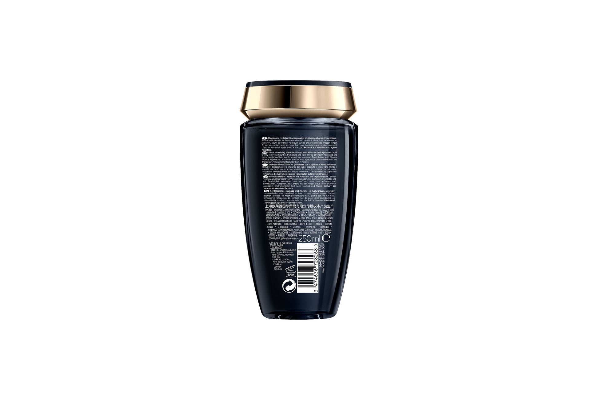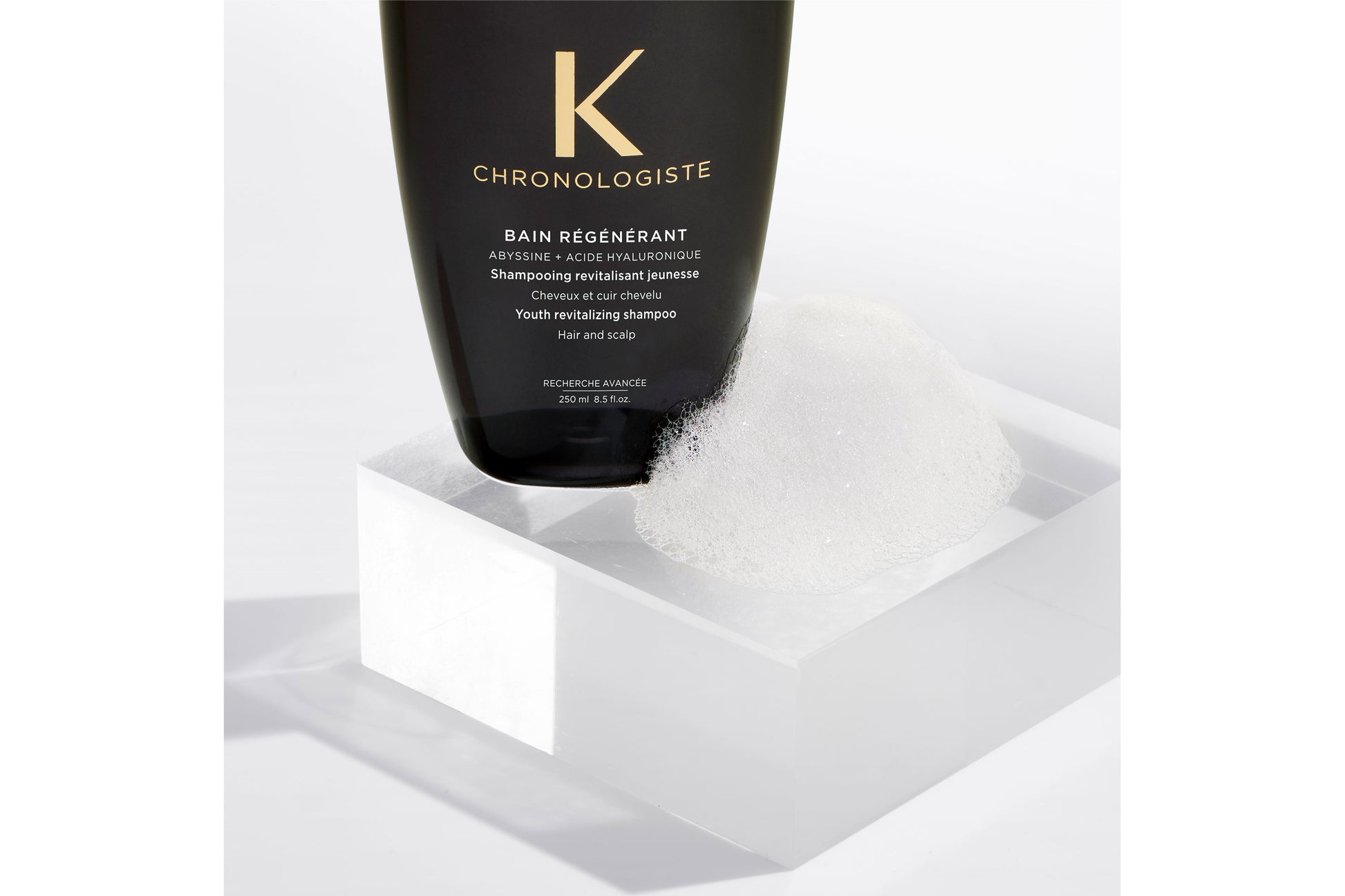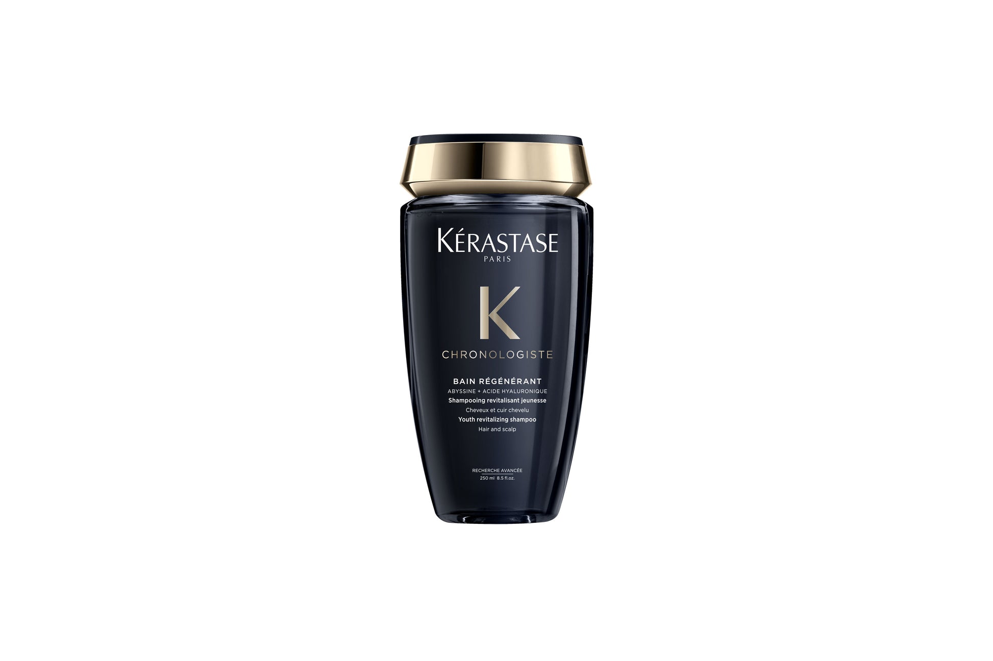 Shampoo regenerador que previene de los signos de la edad tanto en el cabello como el cuero cabelludo. Elimina suavemente las impurezas del cuero cabelludo y la fibra y fortalece el cabello. Gracias al Ácido Hialurónico hidrata el cuero cabelludo y rellena la fibra desde dentro para un cabello por el que no pasa el tiempo. Restaura el brillo.