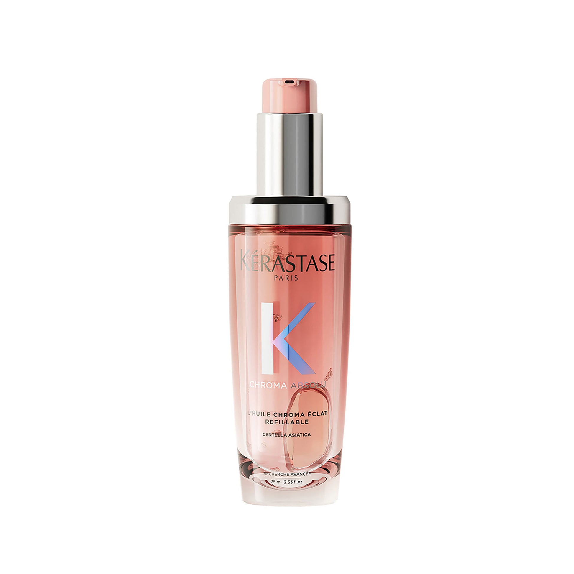 L'huile Chroma Éclat recargable proporciona al cabello teñido un brillo duradero. Enriquecido con Centella Asiática, una planta silvestre que crece en un entorno tropical, el aceite preserva el color del cabello y le aporta un brillo seductor y perfumado.