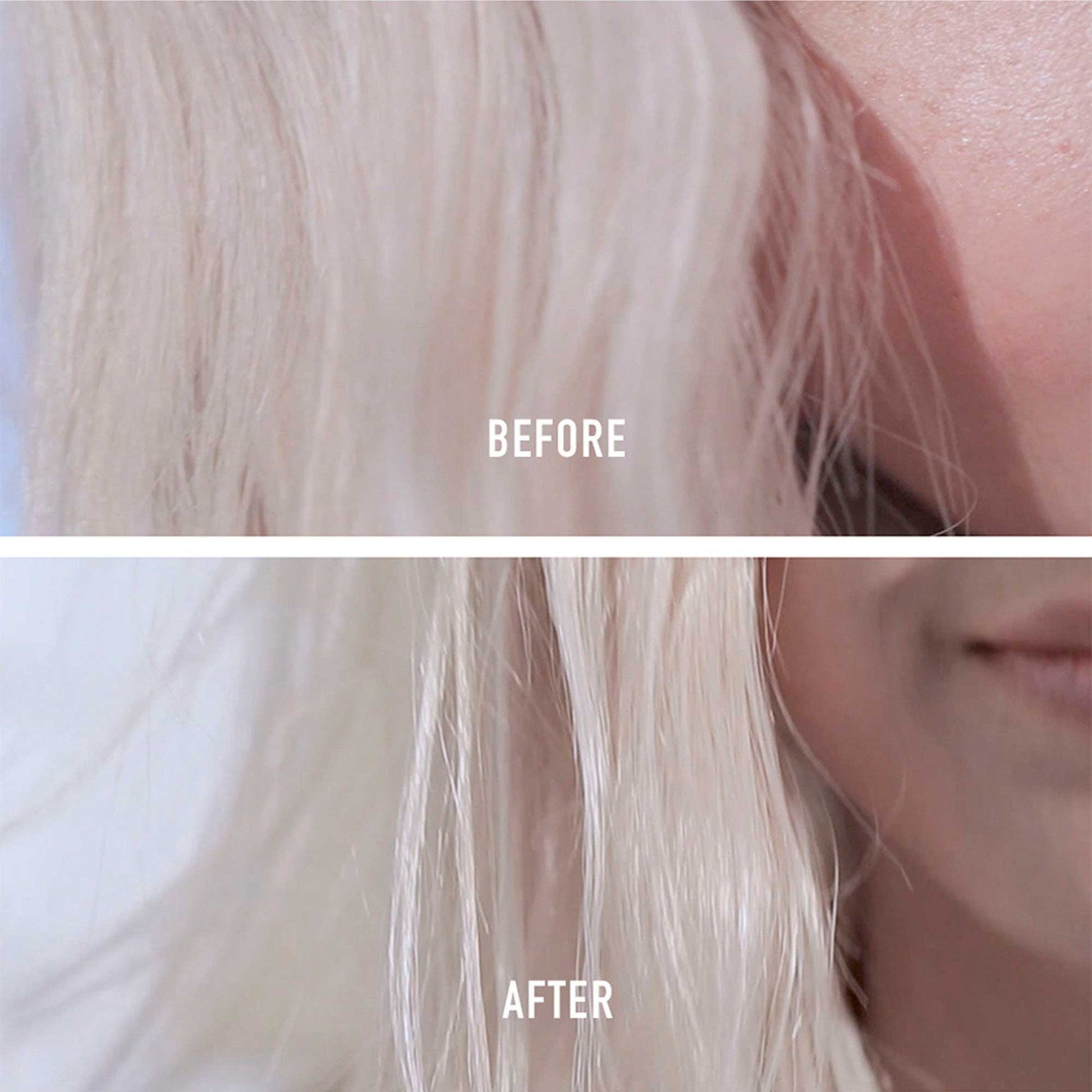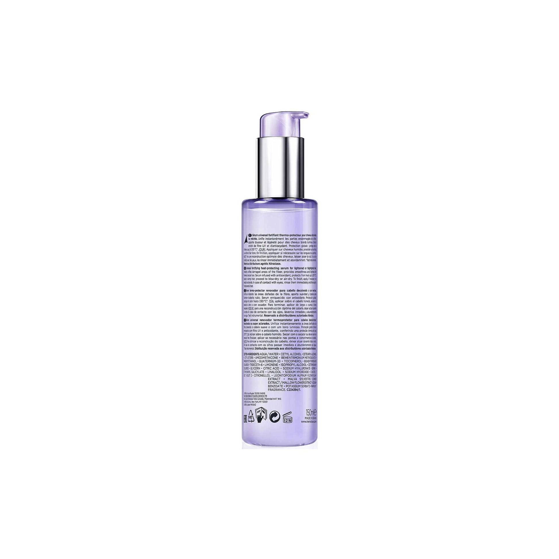 Suero reparador y protector de calor para cabello rubio. Protege el cabello de las herramientas de calor como la secadora y la plancha hasta por 230° C.