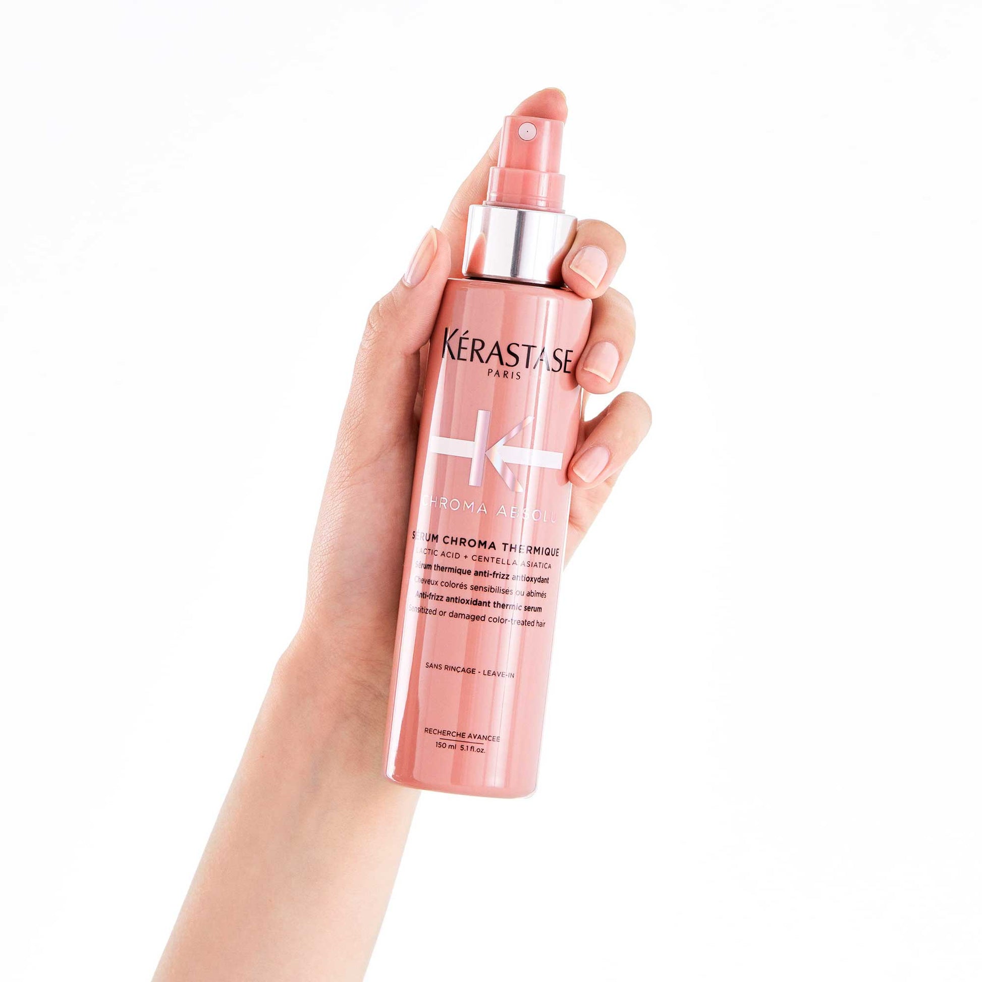 Este sérum en spray de la gama Chroma Crème de Kérastase es un producto indispensable para quienes buscan proteger su cabello teñido o con mechas del calor de las herramientas de styling, a la vez que prolongan la intensidad y brillo del color.