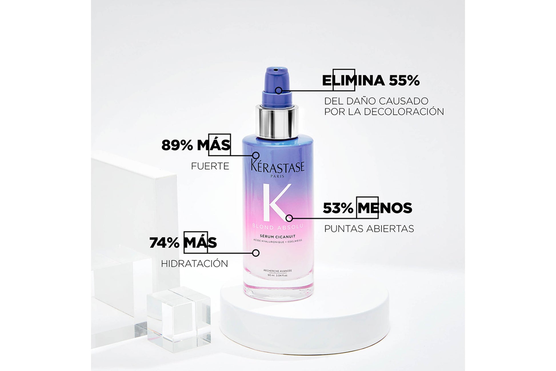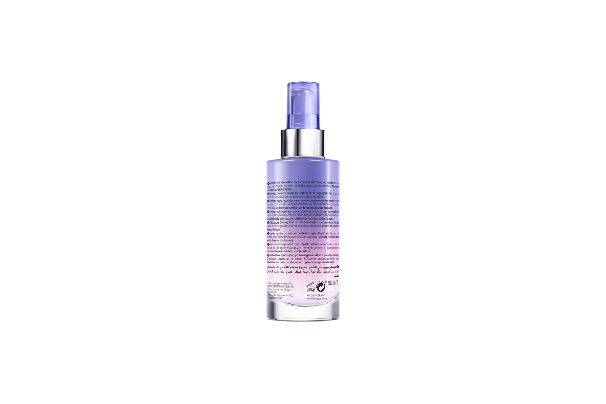 Sérum de reparación nocturna con una alta concentración de ácido hialurónico para restaurar la fibra del cabello decolorado. Mientras duermes, recupera intensamente la fibra. Reduce la ruptura y ayuda a evitar las puntas abiertas.