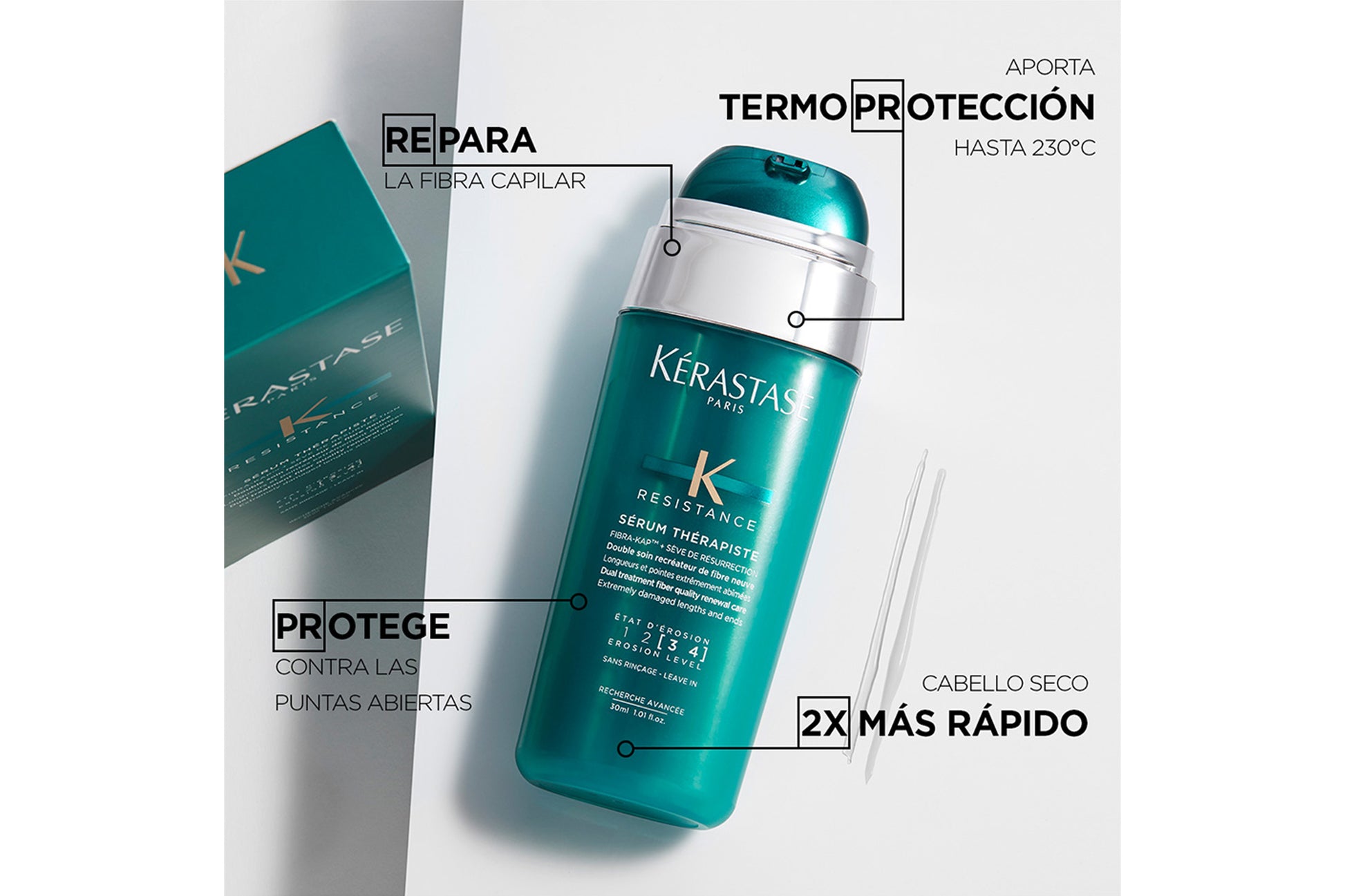 Doble sérum renovador y sellador de medios y puntas extremadamente dañadas. Proporciona protección térmica al cabello de hasta 230ºC además de ligereza y suavidad. Compensa la pérdida de KAPs en el cabello (Proteínas Asociadoras de Keratina que se encuentran en el córtex), neutralizando la pérdida de materia.